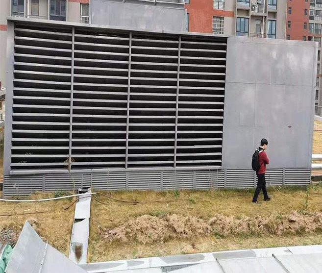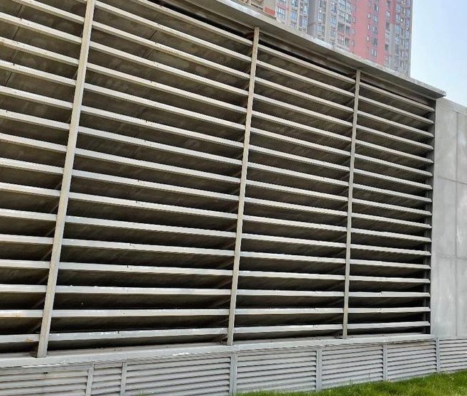 3、進(jìn)氣消聲??照{(diào)外機(jī)進(jìn)氣也是降噪的重點(diǎn)之一。由于空調(diào)機(jī)組設(shè)備較大,排氣量與進(jìn)氣量都是非常巨大的,但是空調(diào)設(shè)備的壓縮機(jī)產(chǎn)生的噪聲值也是非常的高,既要保證降噪效果又要保證進(jìn)氣,所以使用進(jìn)氣斜插式消聲百葉和進(jìn)氣企口。